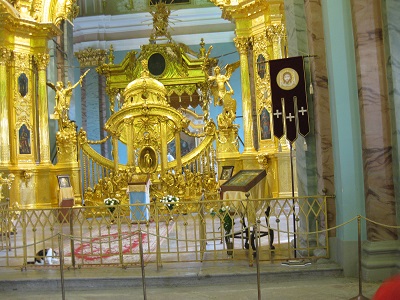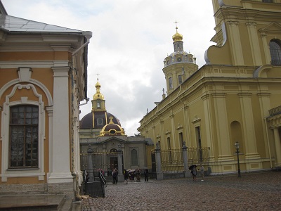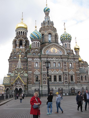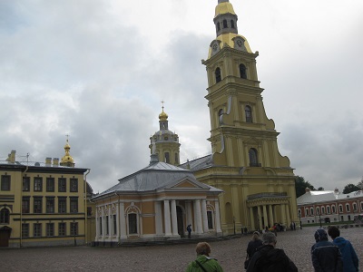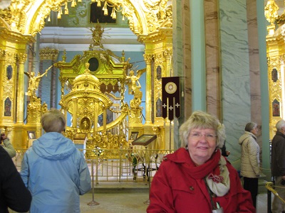 Saint Petersburg, RussiaAfter a long bus ride, we arrived in Saint Petersburg, Russia. We checked into our hotel and settled in for three days in one of the most beautiful cities in the world. Marguerite had been to Saint Petersburg with George in 1996 on their first cruise together. The cruise included a visit to the Hermitage and a bus tour to see the dachas (small garden plots) and city, but did not provide for the in-depth visit we experienced this time. Saint Petersburg was built at the mouth of the Riva Neva early in the 18th century by Peter the Great. It was also designated the capitol of Russia at that time. Saint Petersburg's name was changed to Leningrad during Soviet times. Before the monarchy was overthrown in the Russian revolution, beginning in 1917, the tsars and tsarinas of the empire lived the high life in St Petersburg. The Hermitage was the winter palace; Catherine's Palace was the summer palace. They built colorful, opulent palaces, inspired arts and architecture throughout the city, and created a virtual soap opera of betrayal, Faberge egg collections, and tidily handled peasant rebellions (quoted from the OAT Itinerary book). Saint Petersburg is called the Venice of the North and includes many islands, canals, and bridges. The first morning in Saint Petersburg we visited the Peter and Paul fortress constructed in 1703. Part of the fortress is a large cathedral with a lovely spire and Baroque interior. This is the final resting place of most of the Russian tsars including the last Romanov family -- Nicholas II, Alexandra, and their 5 children who were murdered in 1918. |