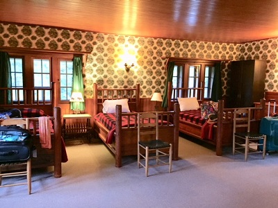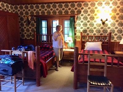 On June 24, we arrived at Raquette Lake, New York, for our five-day Road Scholar Program: America's Treasures: Three Adirondack Great Camps of the Gilded Age. The headquarters for the Program was The Sagamore Great Camp built in 1897 by the visionary great camps designer William West Durant on 1526 acres of remote wilderness. Alfred Gwynne Vanderbilt (a great grandson of Commodore Vanderbilt) bought the property in 1901 and used it as a summer home. Alfred died on the Lusitania in 1915. His widow, Margaret, maintained the Camp until 1954 when she gifted it to Syracuse University. We got our reservation in early and paid extra for a private room. When we were assigned lodging we were given Room 1: Mrs Vanderbilt's room in the Main Lodge. What a treat! The bathroom had a 7 foot bathtub (apparently tubs were purchased by the foot!). We had four beds and lots of space and loved it. |