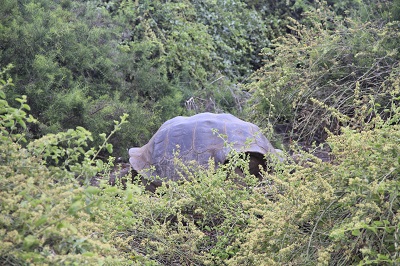 We spent the last day visiting the large Galapagos tortoises! First, we went to visit the free roaming giant tortoises in their natural habitat. In the afternoon we visited the Charles Darwin Research Station, Giant Tortoise Breeding Center, and the town of Puerto Ayora. The tortoises in their natural habitat were pretty quiet and didn't move much as it was early morning and a cool day. The breeding center is amazing. They have had tremendous success in breeding and raising giant tortoise offspring. Of the original 14 sub-species of giant tortoises, at least 4 sub-species are extinct. Lonesome George was a famous tortoise who died last year. He was the last of his kind. Sadly, Lonesome George never produced offspring. During the 1970s, the Darwin Center contacted the San Diego Zoo to see if they had a large male of a similar species who could come back to the Galapagos to breed. The Zoo sent "Diego" who has fathered over 2000 baby tortoises in the four decades and is still going strong! The Darwin Center collects the eggs, incubates them in sand (no heat!) and when they hatch, tends them carefully for 6 years after which they are returned to their natural habitats. When we stopped for refreshments, one of the ladies on the trip got inside a tortoise shell for a photo -- it gives you an idea of how large these creatures really are! As an extra bonus you see two panoramic photos of our adventure taken by Gar's iPhone camera. In the Volcano Island photo you can see Marguerite, third from right in the foreground, being careful not to twist her ankle. In the Ocean View photo, taken from our balcony, you can see we were always within sight of an island or two on this adventure. |