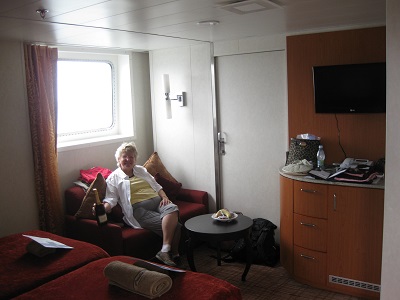 Flight to Galapagos and our ShipOur flight to Baltra was under two hours on AeroGal airlines. Once there, we got onto a small bus that took us to the dock were we found four Zodiacs (rubber boats) to transport us to our ship. The photo on the next row left is of the Celebrity Xpedition. Marguerite had arranged for cabin 604 on the top deck (deck 6) that had recently been remodeled. It was quite spacious and included a wonderful balcony with four lounge chairs. It was on the front of the ship and down below we could see the men raising and lowering the anchor and putting two Zodiacs on and off. There was a Jacuzzi nearby but it wasn't very hot so Gar only went in once. Food was served in a dining room on Deck 3 that included buffets for breakfast and lunch and a semi-formal four course dinner in the evening. We usually took about two hours for dinner that also included plenty of wine (trip was all inclusive for all food, wine, tips, and trips). There was also the "Discovery Lounge" were we spent a lot of time, and several outside decks for visiting and eating. |