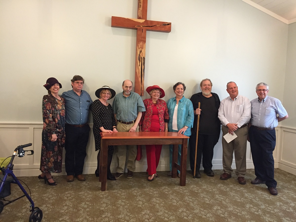 The photo below is of the 9 cousins in attendance at the Dedication: Left to right: Betsy McMillan McCaghren, Jeffrey Neville, Peggy Ray Guin, Richard Neville, Marguerite McMillan Jackson Dill, Carolyn Bennett Broucek, Bill Neville, Lovett Bennett Jr, Joe Neville Jr. The cross over the alter and the alter table were made from lumber milled from a large cedar tree on the farm property. |