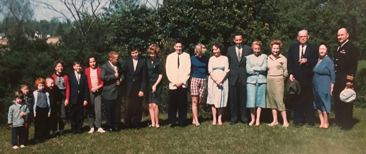 The photo above is of three generations of the Neville family taken in about 1961. From left to right: Jeffrey Neville, Lovett Bennett Jr, Peggy Ray Guin, Robert Karp, Barbara Bennett, Ross Neville, Carolyn Bennett, Bill Neville, Richard Neville, Betsy McMillan, Joe Neville Jr, Marguerite (Wheety) McMillan, Sara Neville Bennett, Joe Neville, Marguerite Neville Guin, Jessica Neville (Karp), Gesmon Neville, Marguerite Nunnally Neville, Gesmon Neville Jr, CDR US Navy. |