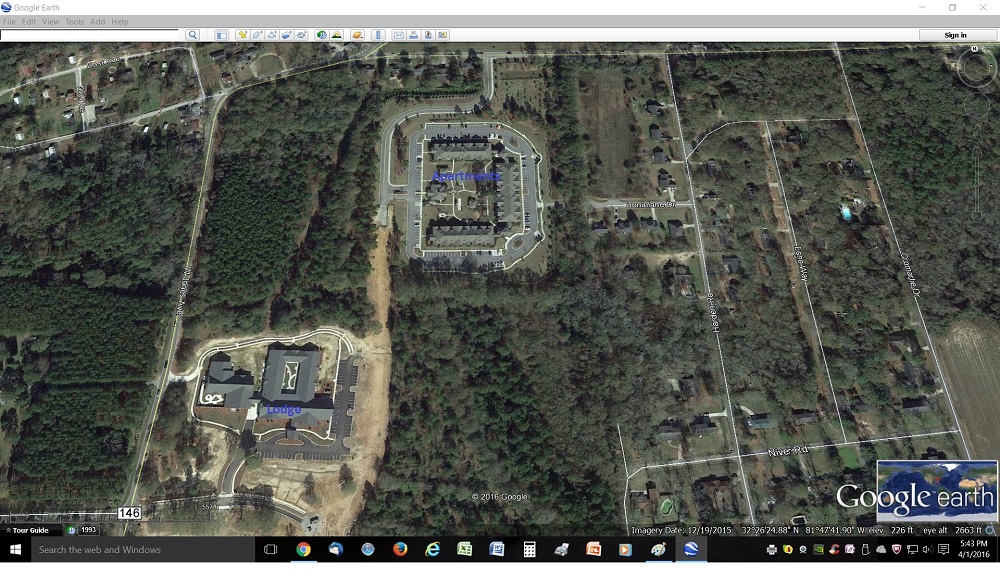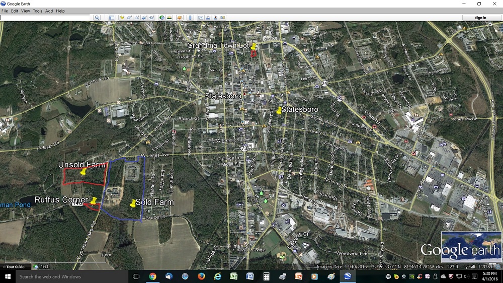 In March 2016 Marguerite went to visit her sister Betsy in Winter Park, Florida. This was done in part to attend a Neville family reunion related to the long-ago sale of the family farm. In 2006, 69 acres of the Neville Family Farm (owned by Marguerite and Betsy's maternal grandfather) was sold to the Bethany Foundation, a not-for-profit arm of the group of Primitive Baptist Churches that are throughout the Southern United States. Several family members belong to the Primitive Baptist Church of Statesboro. Throughout their lives our Grandfather was a Primitive Baptist and our Grandmother was a Southern Baptist. The Bethany Foundation purchased the property and divided it into four quadrants. An assisted living facility (The Lodge at Bethany) is on one quadrant; the Grace Crossing Apartments for low-income seniors are on a second quadrant. The two remaining quadrants will be developed in the future. The Farm is outside of the small town of Statesboro, Georgia (30,000 people plus 24,000 students at Georgia Southern University). The Lodge at Bethany was completed in early 2016 with space for 48 residents. On March 13 they held a Dedication and Open House. The Neville family was invited and gratefully acknowledged for selling the land to them. Marguerite's grandfather's name was William Gesmon Neville, he went by Gesmon, and was born on a nearby family farm in 1892. He passed away in 1965, a few months after "giving Marguerite away" when she married Crawford Jackson Jr. Marguerite's grandmother for whom she is named, Marguerite Nunnally Neville, was born in 1888 and passed away in 1976. Since much of the family still lives in or near Stateboro, GA, it was the perfect time to also have a family reunion. On the map below you see the town of Statesboro with the sold family farm in blue . In red are three parcels of land (about 15 acres) still owned by Neville family descendants (Ruffus Corner and Unsold Farm part of the same legal parcel, Grandma Town lot is separate parcel). |