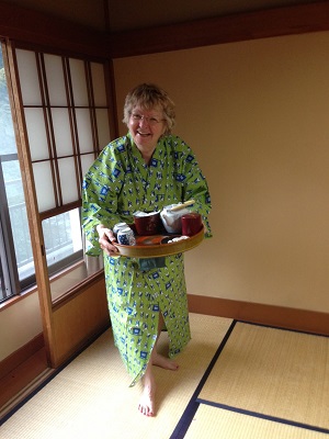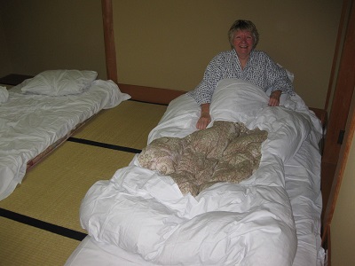 Mount Fuji to HakoneAfter leaving Mount Fuji, we continued by bus to Hakone that is famous for having Japanese Onsen (hot springs for bathing). We checked into the hotel and shared a lovely traditional Japanese meal in a private dining room there. Then we returned to our room to sleep on traditional futons on the floor! (photo below left) With many aches and pains of getting up and down to our futons, Gretchen and Marguerite settled into a fairly comfortable night. Early the next morning we both tried out the Onsen on the lower hotel level, but first were required to take a full shower (including washing hair) to insure we were clean enough to share the experience! The women's and men's Onsen are entirely separate. Everyone was issued the traditional kimono, short jacket, and thong shoes to wear around the hotel. Of course, almost everywhere we went we were required to take off our shoes but socks were encouraged. A bit tricky on slick floors but nobody had any serious falls, thank goodness. Because we were leaving Hakone to go to the next city by bullet train, we were asked to use a small bag to take enough clothes, medicines, etc., for two days. Our large suitcases were shipped ahead to Kanazawa. It is very difficult to manage large luggage on the trains and to get it on and off in the minimum time the doors are open for egress and ingress!! Hakone is a beautiful city and we spent a couple of hours at the Hakone Open Air Museum that has dozens of sculptures (photos below of Marguerite and Gretchen by one of them and also a view of the wonderful trees and foliage). There is also an excellent Picasso museum built in 1984. The gallery presents a wide range of works by Picasso as well as photographs revealing his vast imagination and personal life. We returned to the hotel for another Japanese style dinner. |
