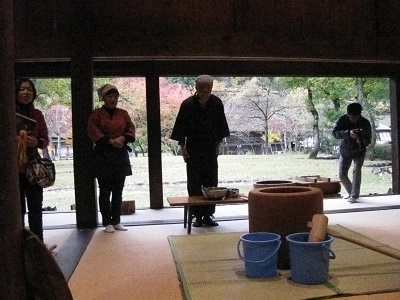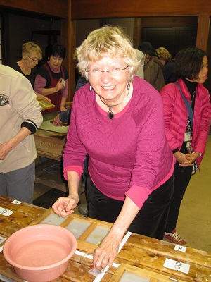 Shirakawa-go and GokayamaWe enjoyed several unique experiences on this day including a visit to a Folklore Park for "Mochitsuki" rice cake making experience and a Gassho-style house where we saw a traditional dance by a local man (see movie below) but had to leave because the smoke was so intense from the cooking pit in the middle of the floor! We also ate "Soba" or buckwheat noodles for lunch at a charming local restaurant. We spent the afternoon at a Paper Making Handicraft Workshop where we made Washi paper by hand. Etchu kokushi or Gokayama washi paper has been made for over 1200 years. It is made from a mixture of Kozo (paper mulberry) fibers and Tororo Aoi (hollyhock) that is cooked for many hours to release the fibers. There are many steps to the procedure. Traditionally this paper has been used to cover the holes in shoji screens used for inside windows and doors in Japanese homes. We also learned about wood inlay (marquetry) to create elaborate patterns by inlaying wood pieces of different colors and types. |