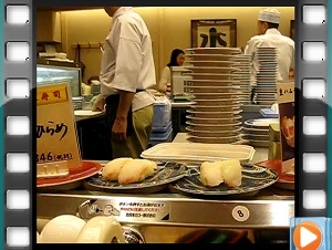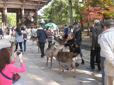 Day Trip to Nara and FushimiThe next day we visited the city of Nara which was the capital of Japan before Kyoto. We visited two UNESCO world heritage sites: Todaji Temple and Kasuga Shinto Shrine. Almost all of the people of Japan are Buddhist and there are many temples. This temple has the Daibutsu -- an impressive 52-foot Buddha statue. The photo of Marguerite below is of the base of the Buddha. Very large flower petals! In the park surrounding the temple are scores of tame, free-roving deer, which were traditionally regarded as the messengers of the Shinto god Kasuga. The deer want to be fed and we were told not to offer food or have papers in our hands as they would steal the paper to eat! The Shinto Shrine site is famous for having over 3000 stone lanterns. In the afternoon we visited the Fushimi-Inari shrine. Whenever we visited a shrine we saw families with children dressed in traditional Japanese kimono outfits. We were told this is because children have special blessings as infants, around 3 years old and around 6 years old. The children are very cute and reminded us of our grandkids! One evening when we had "dinner on own" we visited a "conveyor-belt sushi place" (see movie below) that was lots of fun. Gretchen and Marguerite shared a dozen plates of sushi/sashimi/tempura. Charges were calculated from the number and color of plates -- we mostly had blue plates (least expensive) and a couple of red plates (more expensive). The entire meal for both of us was under $25! |