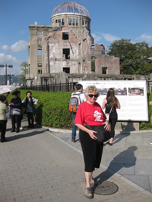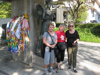 Hiroshima and Peace Memorial ParkSix of us (Gretchen, Marguerite, Renee, Judy Marks, Mary, and Connie) continued on to Hiroshima for three days. We were asked to put clothes, medicine, etc., for 3 days into a small bag for the Hiroshima hotel as we will make the trip to Osaka Airport on a Bullet Train. The first afternoon in Hiroshima was spent at Peace Memorial Park. This was the highlight of the trip for Marguerite. We first went to "ground zero" where the atomic bomb was dropped on August 6, 1945. The bomb actually exploded some feet above the city and the damage extended out over several miles. There was lots of symbolism at the Peace Memorial Park including scores of origami cranes in many sizes. The crane is a symbol of peace. The strings of cranes are hung to show the many tributes that are made continuously in the name of peace. The Park also includes an old building (the A-Bomb Dome) that was a federal building only partially destroyed. It has not been rebuilt and stands as a reminder of the devastation. There is also a monument containing all of the names of people lost in the bombing. The A-bomb museum is very well done and pretty balanced about the USA, considering the devastation and the number of lives lost. There is a model of the blast area that includes the red ball above ground and the area demolished. There were scores of school children in the museum also. We each had a hand-held recorder so we could hear the narrative about the objects. They were also labeled in Japanese and English. At the end was a very poignant photo talking about recovery after the devastation. |