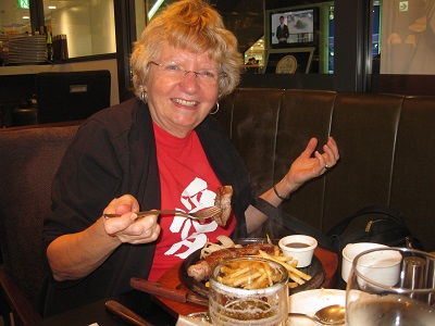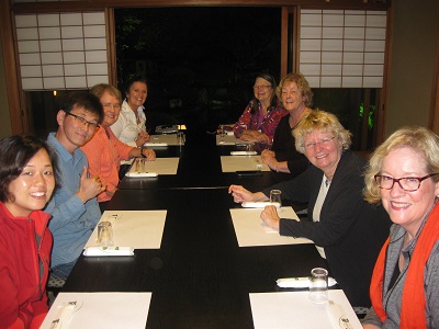 Farewell Dinner and HomeOur farewell dinner in Hiroshima was lovely. We went to a traditional Japanese restaurant and had fancy bento boxes of many interesting items made from tofu. The restaurant was very lovely, quiet, and our dining room looked out over a beautiful Japanese garden. The next morning we got on the bullet train to Osaka. At the airport, we retrieved our large suitcases and sat on the floor to reload them with dirty clothes and things from the small bag. We could only take one carry-on and a personal item (same as in the USA) so lots of stuff got stuffed into the big suitcases so they could be checked. At the airport we had time for a meal and went to a Western style restaurant for salad, steak, and fries. We were all ready for familiar American food!! The trip home was uneventful, about 24 hours total, and we were all very ready to get home. |