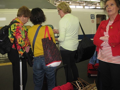 Hakone to KanazawaThis morning we had our first experience with a Japanese Bullet Train. Wow! It really goes fast (about 150 miles per hour). We had purchased some "bento boxes" for lunch and ate on the train as we watched the scenery zipping by. We then changed to a local train in Nogowa and arrived from the station to go to our hotel to meet our large suitcases and settle in for dinner. The next day was took a chartered coach to visit an Ochaya -- an establishment where Geisha entertain their patrons). We learned about the Geisha tradition from a lovely lady who helps run the establishment. We learned that the Geisha in Kanazawa are in a union, can be married, and entertain guests (mostly but not exclusively men) for 90 minute sessions each evening. A session includes dancing, dinner, and conversation. She assured us that Geisha do not provide sexual favors to guests! We also visited the Kenrokuen Garden that is quite lovely and frequently crossed paths with school children dressed in their uniforms and colored hats! |