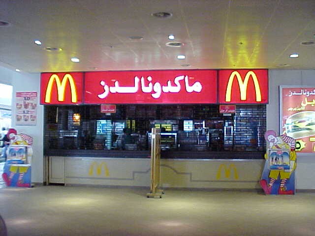McDonalds in MallIn the major mall in Riyadh the food court had this McDonalds. The left side of the counter was for families to order and the right side was for men to order. The sexes are kept separate as much as possible in public. I was in the mall about noon time and 95% of the people in the mall were male. Shops close from noon to about 4 PM for prayer. Apparently the ladies go shopping in the evening with thier husbands or other ladies. |