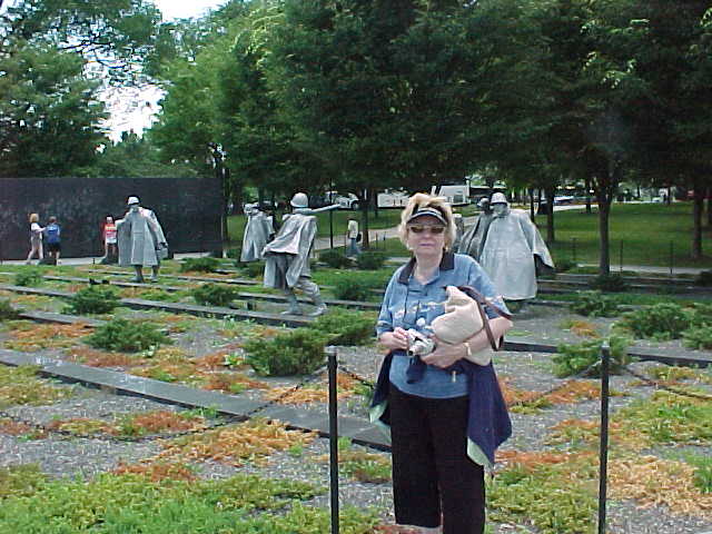 Marguerite at FDR Monument in Washington D.C.Also the first day of our trip had as an objective to visit all the new monuments. The first new monument we visited was the FDR monument which is really a large display of many things. Here you see a statue of FDR and his dog. |