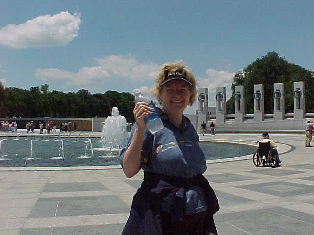 World War II MonumentHere you see Marguerite with her water bottle at the new WW II Memorial. It was very warm that day and we were tired from the red-eye flight and all the walking we have done so far. This monument is near the Washington Monument which had a lot of landscaping going on which subtracted from the feeling. George contributed to the monument in the name of his Uncle Nuchie who served in Europe during WWII. |