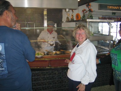 Lunch TimeOf course after boarding the ship and putting the bags into our cabin we needed nourishment. The ship had three formal restaurants, two outside food bars, and 10 inside food bars with one devoted only to pizza. Here Marguerite is in line for her first of many meals on the ship. Although we ate ourselves silly, with all the stairs we had to climb we did not gain that much weight. |