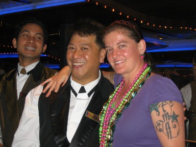 Farewell EveningAfter a day on the ship just floating in the Pacific we had our final farewell dinner. All the waiters sang for us and in this photo Misty is helping our waiter sing his song. After the evening show Marguerite and George went to the cabin for a nice evenings rest and Misty and Pauline stayed up all night.