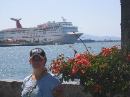 Walking Back to the ShipMisty and George walked back to the ship rather than having guacamole. It was a lovely little port with this nice photo opportunity with flowers, Misty, and our ship in the background. |