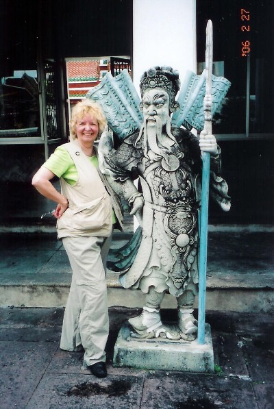 Marguerite “Striking a Pose” in BangkokThere were many statues of all sorts everywhere. Marguerite’s “misshapen” look is from carrying all of her possessions in the inside pockets of her vest – we were warned to beware of pickpockets, but did not experience any thefts or safety challenges during our trip. The weather in Bangkok was hot and humid, so the convertible pants came in handy – bottoms could be zipped off to make shorts. |