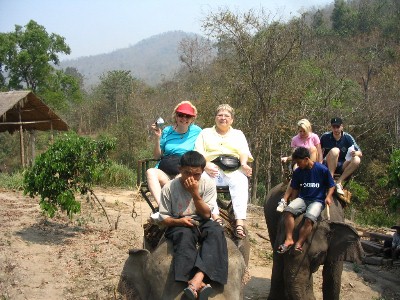 Riding ElephantsThe next day we took a tour that included an hour-long elephant ride through the hills outside of Chiang Mei. It was quite an experience! Marguerite and a Canadian woman were on the lead elephant, an ornery male, who used his tusks to de-bark a couple of trees and snack on the bark along the way. The ride was quite bumpy, and staying on the elephant required hanging on to the seat – as a result, Marguerite had a sore hip for several days!! |