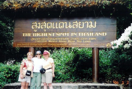 The Highest Spot in ThailandMarguerite, Gretchen, and Beth at the highest spot in Thailand – about 8,000 feet above sea level. This spot is inside a beautiful national park, Doi Inthanon, that also includes a huge national garden, hundreds of greenhouses, as well as a hill village for the Karen tribe that was Christian rather than Buddhist. The Thai government supports the park and also has some experimental laboratories to improve the quality and heartiness of fruits, vegetables, and ornamental plants. Some of the healthiest green things we had ever seen!! |