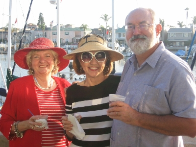 Margaritas on the PatioThe party started with margaritas on the patio where the wedding party, family, and close friends enjoyed both visiting and the sunset before moving inside for a buffet of fish tacos and all the fixins'. Marguerite and George hosted this affair, welcomed the guests, and a good time was had by all. In this photo are Gus Bonaminio (George's brother-in-law), Marie Bonaminio (George's sister), Mother of the Groom, and Carol Archibald (California non-blood sister of Marguerite). In the background is Newport Beach harbor. |