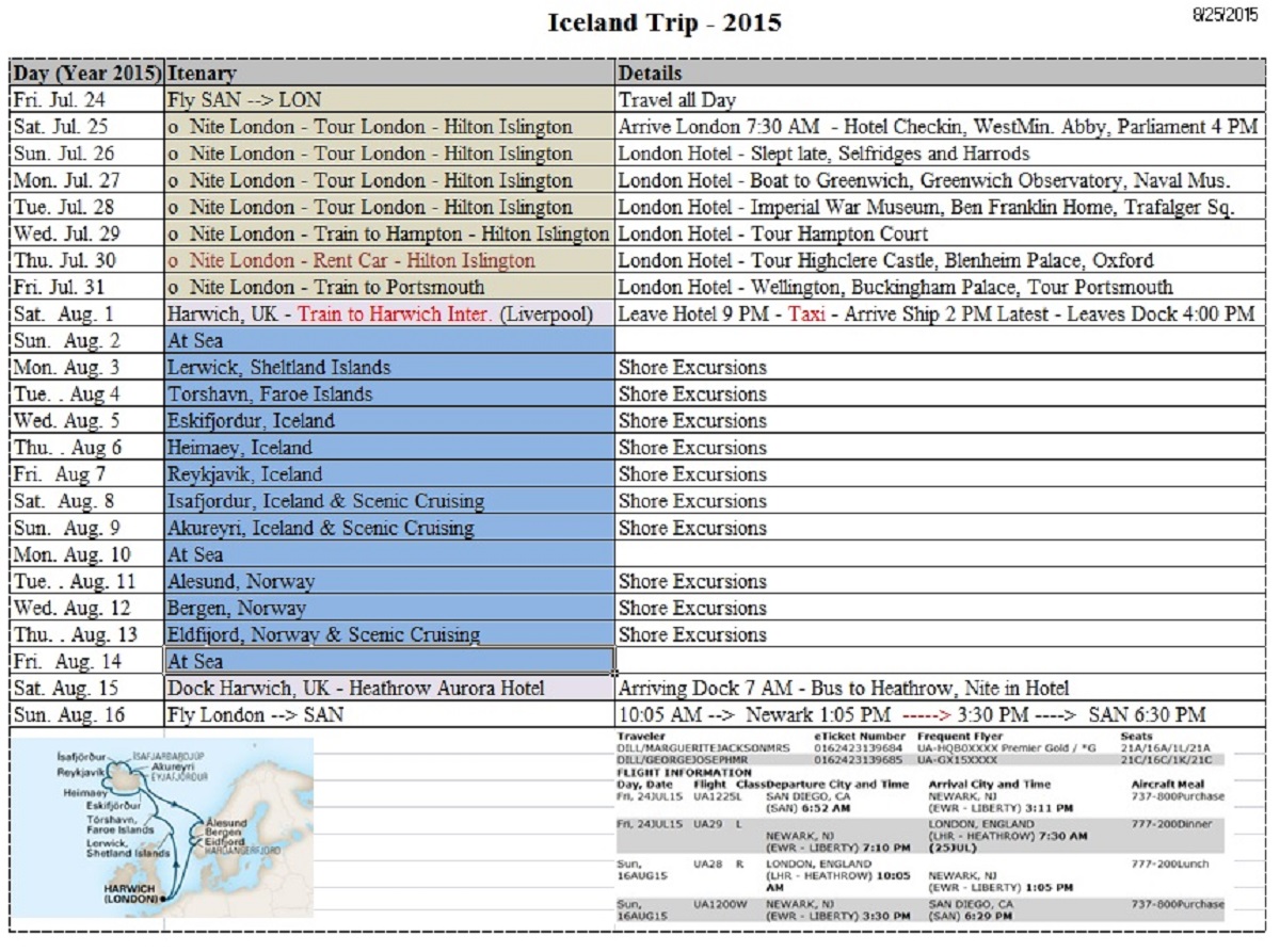 Marguerite decided we needed another cruise so we selected Iceland as a destination since our last Panama Canal Cruise was so hot and unsatisfying. But to get good airline tickets we had to go a week early which forced us to do London again before doing the Cruise out of Harwich, UK. Below is a spread sheet of our planned vacation as it materialized. The summer crowds, the old age, and the been-there-done-that made George's London's tour expectations a fantasy. |