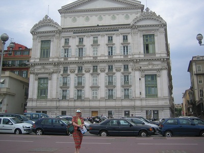 Nice, FranceOur first stop was Nice, France. We decided to use this city, developed by rich British and Russian aristocracy during the 1800s, as a base of operations. Anybody who was anybody had a minor mansion in Nice back then and as a result Nice is covered with old mansions used mostly as apartments today. In this photo Marguerite is in front of the City Opera House which is located on their boardwalk. The beach is not that nice since there is very little natural sand on the Riviera. But they import it when needed. |