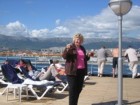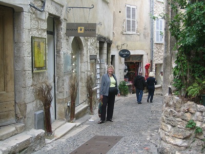 CannesWe then got a guided tour of Cannes. In this photo you see Marguerite on the Cannes beach in front of the auditorium where they hold the Cannes Film Festival. The festival started the following week so we were there during the set up. Cannes is a beautiful commercial, imported sand, Gucci Beverly Hills type place with crowded streets and beautiful everything. This is not where we would want to live. |