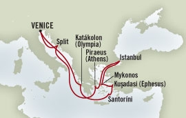 Our CruiseOur trip started in Venice and ended in Venice. From Venice we went to Split, Croatia, founded by Emperor Diocletian in circa 300 AD. We then went to Athens and toured the Parthenon. On to Istanbul to tour Mosques, Churches, and Palaces. Then to Mykonos and Delos for some Greek history and then to Ephesus for some Roman history. Then to Santorini for some Minoan history (rather the destruction thereof). Back to Greece and Olympia. This is where they had the Olympics and religious services to the Greek Gods. Finally, back to Venice for more touring of that city. The Venice Lido island was a very pleasant surprise. By the end of the trip we could get around Venice via water bus better than Escondido. |