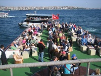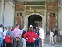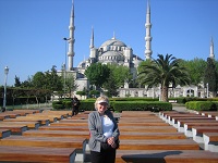Istanbul, TurkeyGeorge had been to Istanbul before so he knew what to expect. This city is like no other. We started with a dinner cruise on the Bosporus. We had some Turkish delights and a view of mega-million dollar homes on the river. We did not realize how luxurious this area was. The next day we had tours of the Blue Mosque, Topkopi Palace, and we walked all over the old city (got a McDonalds burger too). The first picture below shows us on our dinner cruise on the Bosporus, second shows the Bosporus shore line, third shows Marguerite at the Blue Mosque, the fourth shows our cruise ship as seen from the old city, next is entrance to Topkopi Palace, and finally we see George on the deck of our ship with the Blue Mosque in the distance. |