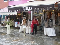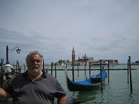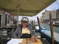 Venice & Murano & BuranoMarguerite and I have been to Venice before so we had no need to tour. However on our first full day we took a tour of Murano and the famous glass works plus Marguerite wanted to buy some handmade lace at the lace island near Murano. The first three photos below show a Murano glass blowing demo, the leaning tower of Murano, and Marguerite shopping for lace on the lace island (Burano). After the cruise we spent a night in Venice and below you can see our hotel along the canal, Marguerite having lunch near our hotel (one could see the snow covered alps in the background), George near the gondola rides, St. Marks Square under high tide and flooded, and finally Marguerite, with bad leg, sitting on a park bench on lovely Lido Island. |