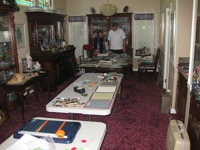 Gar Visit to Review ProjectWe laid out the project on 3 long tables in the living/dining room of our house. Gar came down to see our progress a few days into the project. He was very pleased and a bit overwhelmed. It looked like lots of piles of photos and some constructed pages at that point. Once we found appropriate photos and other memorabilia, I wrote narrative to go with it. All of these materials were adhered to "scrapbook" pages, then copied at Kinko's on cardstock to be put into the albums. |