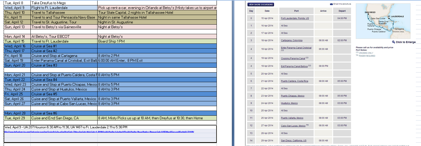 Marguerite and George agreed we would do the "old people" Panama Canal cruise when we got old. Well this year we both have to do IRS Minimum Required Distribution on our IRAs so that makes us officially old. As shown, our cruise was from Fort Lauderdale, FL, to San Diego thus eliminating one air leg of the trip, George hates to fly commercial, even when Margueritie uses United miles to buy him a first class ticket. The trip was on the Holland America Westerdam that we were on when we did the Eastern Med cruise in 2010. Similar to the Med cruise we planned to do a Florida pre-trip to maximize our sightseeing in this part of the planet. Below are photos and commentary on our trip (yes Florida not as interesting as the French and Italian Riviera). Our trip was 2500 miles by air, 1500 miles by car, and 5000 miles by ship. |