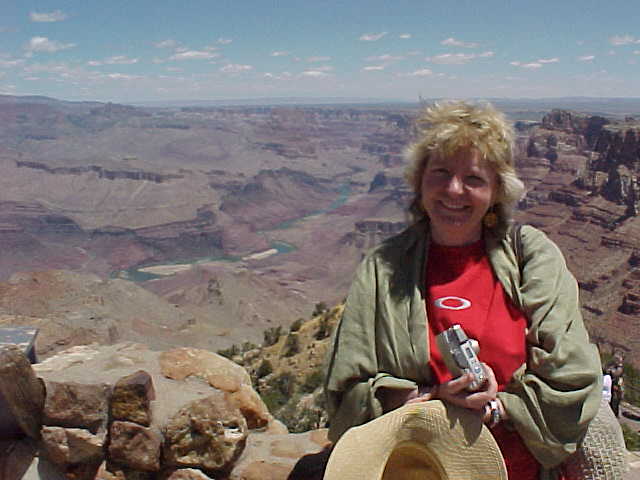 Marguerite at Grand CanyonMarguerite was not impressed with the Grand Canyon. You can see the Colorado River at the bottom of the canyon. In 1963 I went to the bottom of the canyon and back up totally unprepared. It is only 1.5 miles as the crow flies to the bottom of the canyon from this point. By the trail it is only 9 miles down. But to come up it is like 900 miles because of the heat and the altitude. Took an hour and a half to go down and 9 hours to get back to the top in 1963 by two 19 year old soldiers (me and a buddy). |