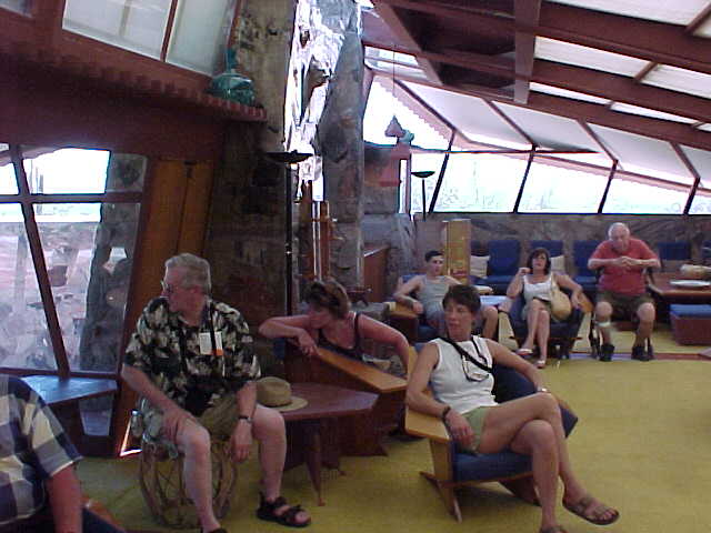 Our Tour Group Inside Main BuildingThis is our tour group inside the main building at Taliesin West (Taliesin is a Welsh word meaning brow, since Wright like to blend with nature and like to build on the brow of a hill). Most of the buildings were built by students as projects and did not have real glass until the late 40's. |