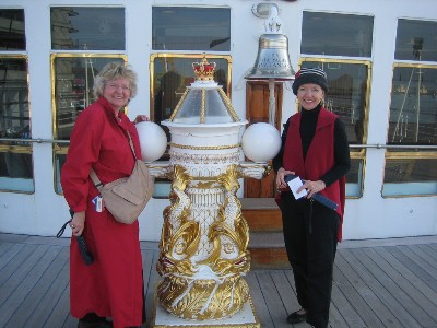 | Hail BritanniaA highlight of the trip for both ladies was an optional tour of the Royal Yacht Britannia. Until about 10 years ago, this yacht was the royal residence for the Queen's glittering state visits and family holidays. It is now permanently berthed in Edinburgh harbor as a tourist attraction. We took a self-guided tour with a "hand held wand" and learned about how the Royal Family and crew of 240 lived and worked on board. At any one time there were probably fewer than 30 guests, so the guest to crew ratio insured enormous personal attention. Of course, we did some shopping at the gift shop attached to the venue!! Marguerite and George had also visited this Yacht in 2003 and have a similar picture with the yacht's bell. |