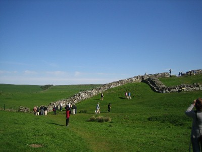 | Hadrian's WallAn early visit was to Hadrian's Wall, the Roman coast-to-coast defense against marauding northern tribes. It is now a national park. As you can see, the weather was gorgeous -- no rain and clear skies the entire trip. You can see Betsy in red. |