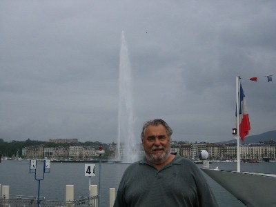 GenevaThe next morning we were off for Geneva, Switzerland. By the way, the train up the mountain to Zermatt was most interesting. It had little grab mechanisms on the train like a roller coaster to grab the track going up the steep hills otherwise the train would never make it up the mountain. The water falls and the Alps were beautiful. I digress, back to Geneva. Geneva is in the French section of Switzerland and therefore it is not as clean and well organized as the German section. The photo is of George in front of the famous Geneva fountain, which shoots very high in the air. |