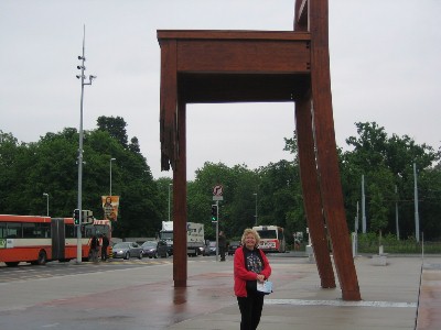 UN Office in GenevaThis is MJ in front of the UN facilities in Geneva. The "Broken Chair" is sidewalk art that is a tribute to the people killed and maimed by land mines in recent years. We did not get into the UN for a tour (not enough time) but we did see the folks going to work and the guard dogs and the limousines of the diplomats. Security was very tight everywhere around the UN campus. |