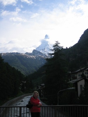 MatterhornThe next morning we went to Zermatt, Switzerland, in the middle of the Alps. This is a ski resort and the home of the Matterhorn Mountain. The photo shows MJ in front of the Matterhorn in downtown Zermatt. We stayed at a nice resort hotel and took our only swim on the trip. In the summer this is a Craig Tyndall paradise with many hills to climb if you can get the sheep to move out of the way. All night in our hotel we could hear the sheep talking in the mountains surrounding the village. |